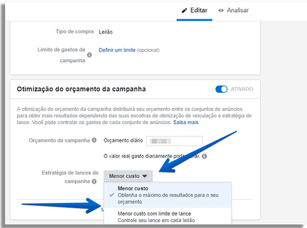 Na primeira opção, o Facebook irá automaticamente buscar o leilão onde seu anúncio poderá ganhar com o menor custo possível. Já na segunda, você definirá um limite, o que pode derrubar seu alcance caso ele seja muito baixo.