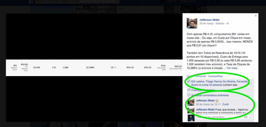 Outro post exemplar foi feito pelo meu amigo Jefferson Midei, que também postou uma estratégia de anúncios que ele estava utilizando. Isso gerou mais de 50 curtidas e dezenas de comentários. O resultado final foram várias pessoas pedindo consultoria para ele. Confira o post logo abaixo: