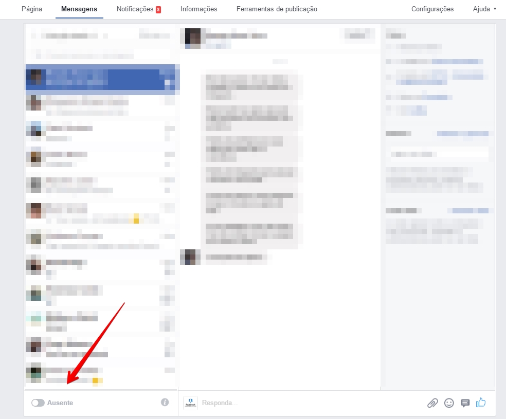 Para ativar o modo Ausente no Facebook Messenger, acesse a área de Mensagens na tela principal de sua fanpage.