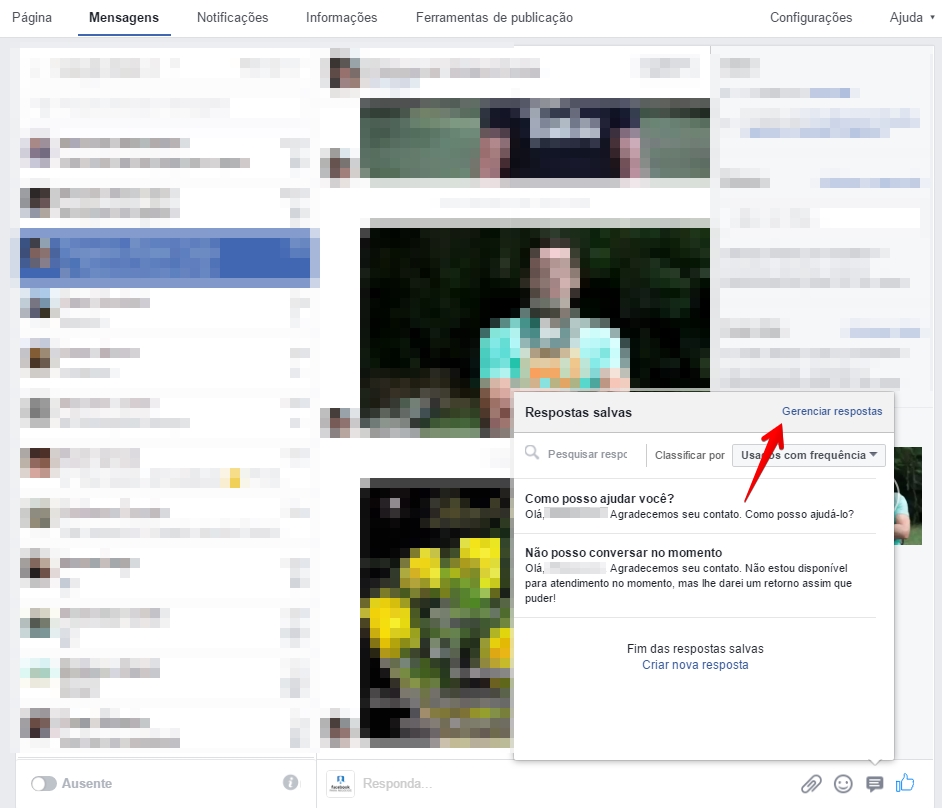 Dado o primeiro passo, a partir daí seus seguidores poderão enviar mensagens diretas para sua página. O próximo passo é configurar as saudações ou respostas automáticas em sua página no Facebook. Como o próprio nome diz, as respostas instantâneas são dadas assim que um seguidor envia uma mensagem para sua fanpage. Já as saudações são mensagens automáticas enviadas no momento que alguém abre uma janela de conversa com sua página no Facebook.