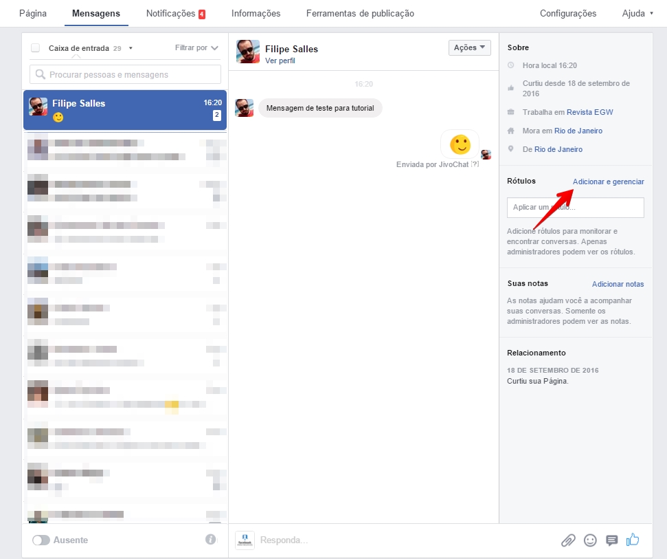 Adicionando rótulos e notas no Facebook Messenger para negócios